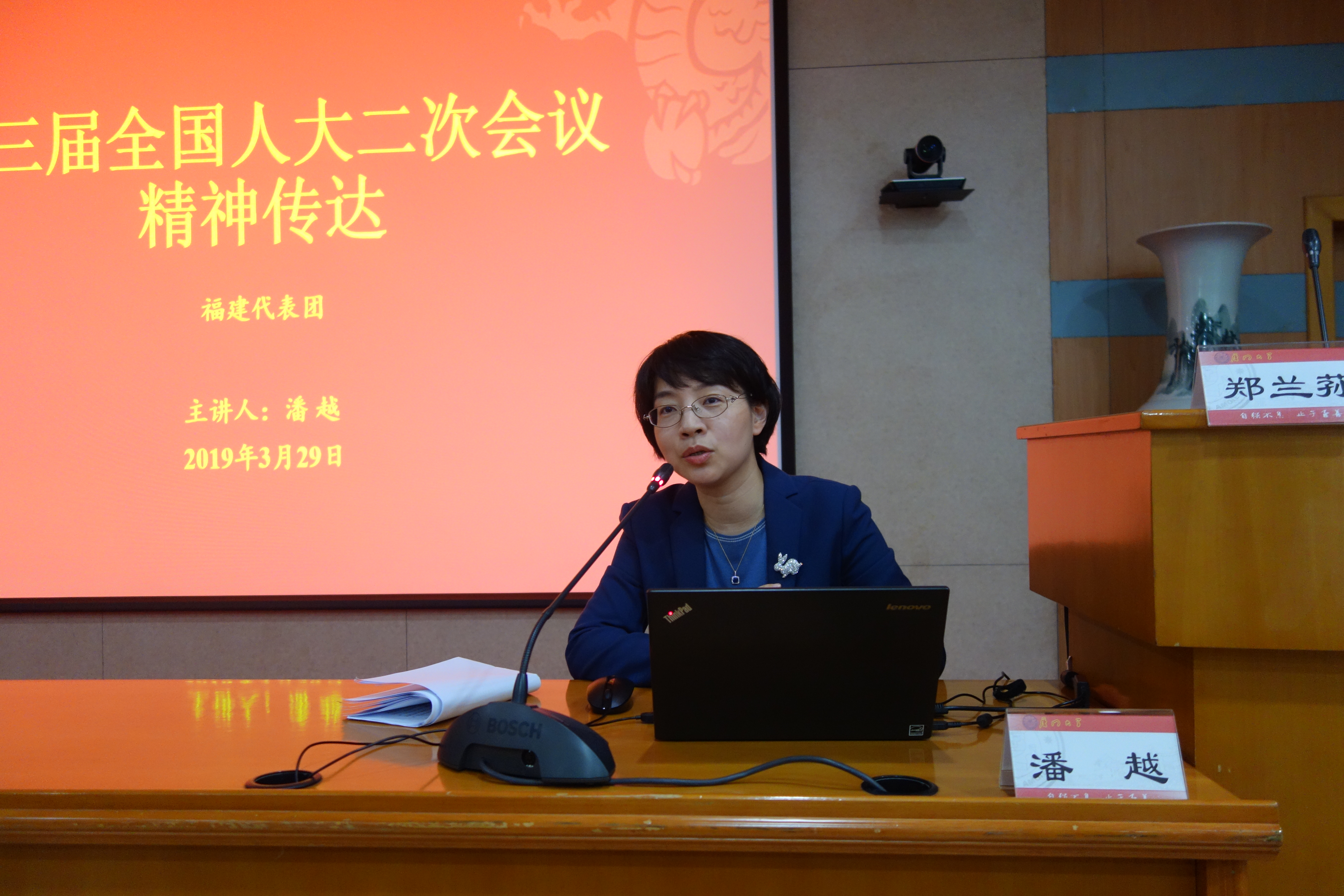全国人大代表、我校经济学院潘越教授介绍了十三届全国人大二次会议的基本情况、政府工作报告主要内容,福建省代表团主要活动和工作,党和国家领导人在参加福建省代表团讨论审议时的讲话要点,重点传达了习近平总书记在参加福建代表团审议时的重要讲话精神,畅谈了自己参加福建代表团审议的感受体会。她说,习近平总书记在参加福建代表团审议时就营造有利于创新创业创造的良好发展环境,探索海峡两岸融合发展新路,做好革命老区、中央苏区脱贫奔小康工作等发表了重要讲话。习近平总书记也充分肯定了近年来厦门和厦大的发展,指出厦门大学是在全国很有影响力的大学,对福建的发展和厦门的发展‘功不可没’,提供了智力支持和科技支撑。
