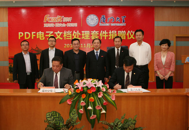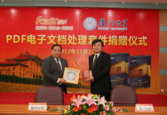 杨振斌在致辞中代表学校对支持厦门大学事业发展的福昕软件公司表示衷心的感谢和诚挚的敬意。他表示,此次福昕软件公司的捐赠必将为推动厦门大学数字化校园建设,特别是推动我校电子公文、电子档案等电子文档的处理和服务起到积极而深远的影响。同时,他希望校企双方以此次捐赠为契机,推动双方在软件正版化工作、PDF软件的推广及应用、学生实习及就业等方面开展更为紧密的交流与合作。