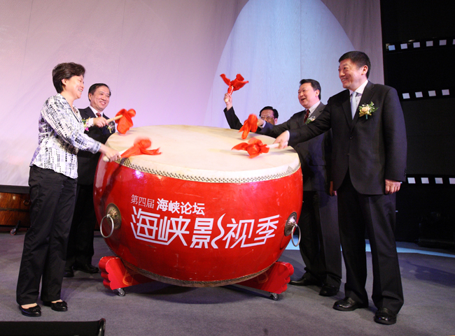 6月15日下午,作为海峡论坛重要组成部分的第四届海峡论坛·海峡影视季在我校科学艺术中心隆重开幕。国家广电总局党组副书记、副局长张海涛,福建省委常委、副省长陈桦,台湾中华文化推广协会理事长赵怡,我校党委书记杨振斌,中广协会电视制片委员会会长、中央电视台原台长杨伟光共同敲鼓开启了海峡影视季。