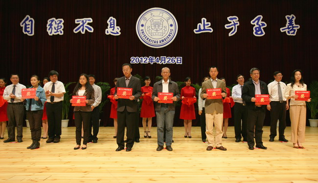 校党委书记杨振斌主持大会并宣读表彰决定,校长朱崇实做题为《协同创新 夺取我校科学研究的新胜利》的总结讲话,副校长李建发、张颖先后做2011年度文科和理工医科科研工作总结报告,提出了2012年我校的科研工作思路。校领导陈力文、孙世刚、赖虹凯,校长助理韩景义、叶世满等出席会议,院士,文科资深教授,全校副处级以上干部,各学院(研究院)科研平台、基地、项目负责人,科研秘书参加会议。与会的校领导和校长助理为获奖的单位和个人颁奖。