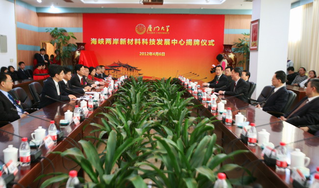 4月6日上午,海峡两岸新材料科技发展中心签约仪式暨揭牌仪式在主楼215会议室举行。中科院院士、中国材料研究学会理事长、原中南大学校长黄伯云,台湾材料科学学会理事长、原台湾联合大学校长金重勋,台湾元智大学校长彭宗平教授,国家自然科学基金委港澳台事务办公室副主任王逸,厦门市科技局副局长徐平东,厦门市产业技术研究院常务副院长曾尔曼,我校副校长孙世刚出席仪式。仪式由厦门大学材料学院院长刘兴军主持。