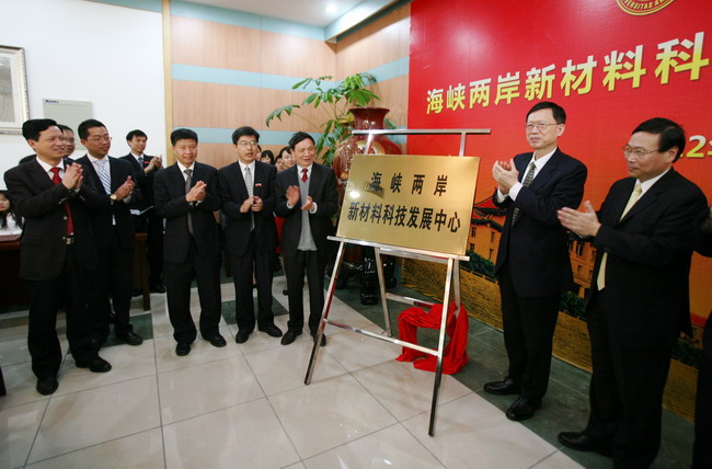 随后,两岸材料学会签署了“共同设置海峡两岸新材料科技发展中心”协议。黄伯云、金重勋、彭宗平、王逸、徐平东、孙世刚、刘兴军共同为“海峡两岸新材料科技发展中心”揭牌。孙世刚代表学校向两岸材料学会分别赠送礼品。