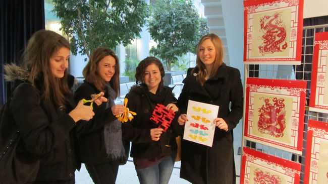 1月19日,就在龙年即将到来之际,西巴黎大学孔子学院携手巴黎ESILV Léonard de Vinci工程师大学举办了中国文化开放日活动。在ESILV Léonard de Vinci工程师大学的教学楼大厅内,张贴着对联、高挂着灯笼,洋溢着喜气洋洋的中国年味儿;两侧分设了各种活动项目:茶艺表演与品茗、中国民俗剪纸、中华图书展、中国书法表演、中法学生面对面、中华武术表演、中国电影展、汉语体验课等。