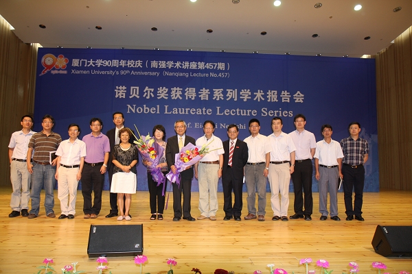 此次讲座为厦门大学90周年校庆诺贝尔奖获得者系列学术报告会的延续,并为“南强”学术讲座第457期。副校长赖虹凯、中科院院士赵玉芬、郑兰荪,化学化工学院书记金能明、院长黄培强、副院长夏海平、江云宝等出席了本次讲座。讲座由黄培强教授主持、赖虹凯副校长致欢迎辞并介绍Negishi教授简历。Ei-ichi Negishi教授的讲座以金属钯催化的交叉偶联反应为主题,围绕有机合成化学在医药、材料、生物等领域的广泛应用展开。讲座中Negishi教授还从他的成长、研究经历,探讨如何学习自然但并不圜于自然乃至超越自然的科学思想。本次讲座中,Negishi教授特别引用2004年发表于"J. Am. Chem. Soc."上的一篇理论研究研究结果解释他的钯催化交叉偶联反应中反应物之间的协同作用,该篇唯一被引用的课题组外的研究论文出自化学化工学院长江学者吴玮教授等的实验室。
