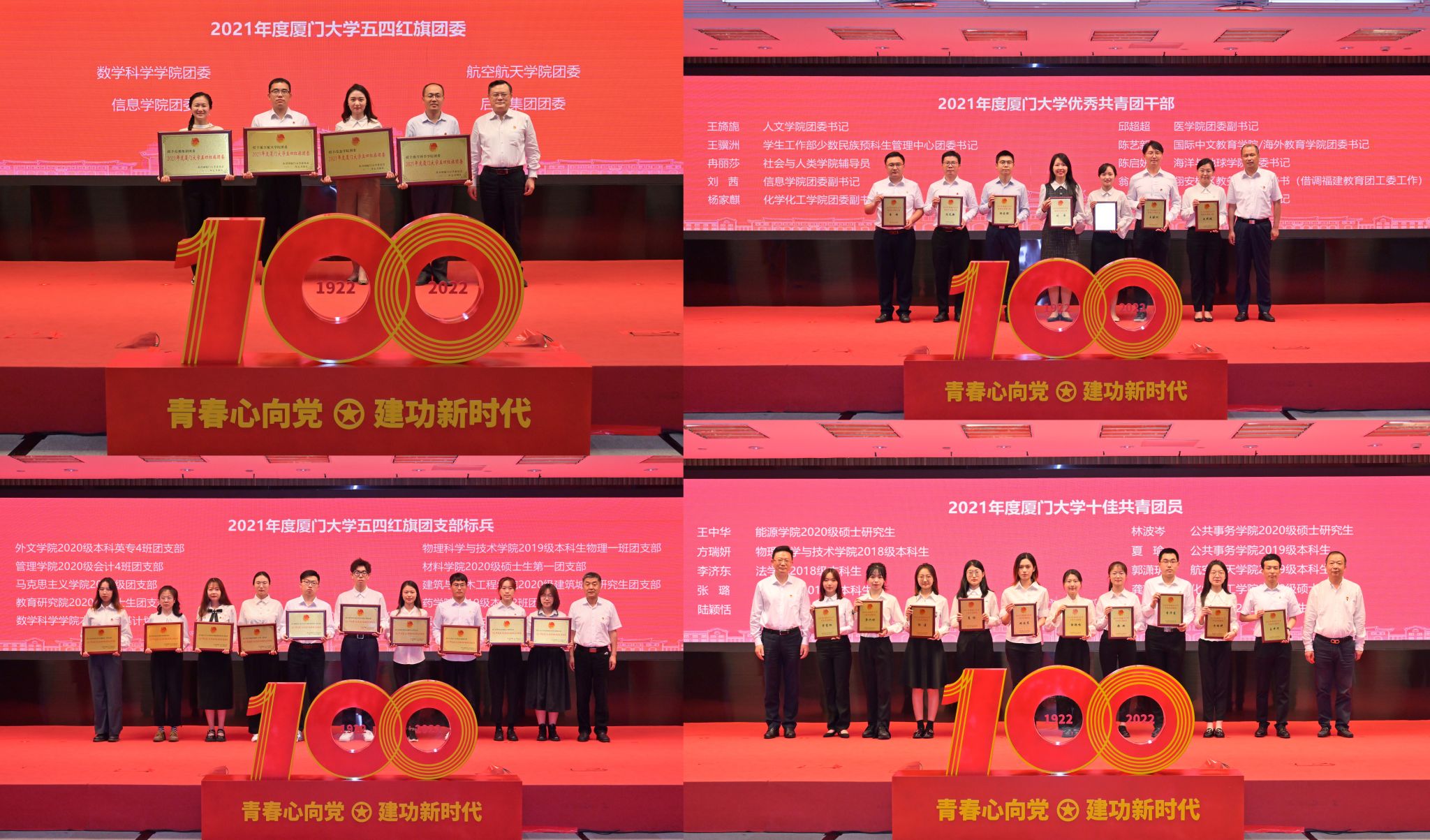 会上表彰了2021年度厦门大学共青团工作优秀个人和先进集体,校领导为获得2021年度“厦门大学十佳共青团员”“厦门大学五四红旗团支部标兵”“厦门大学优秀共青团干部”“厦门大学五四红旗团委”表彰的优秀个人和先进集体颁发奖牌。