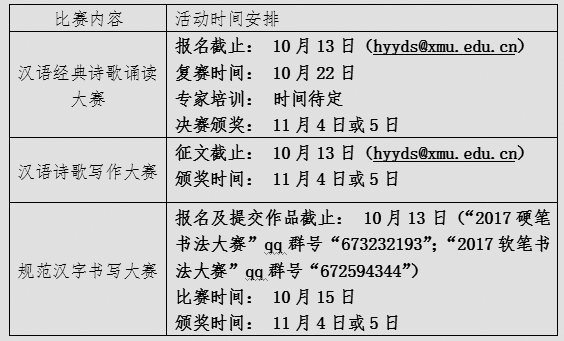 厦门大学2017汉语言文字应用系列大赛以“我的诗篇”为主题,比赛活动内容由 “汉语经典诗歌诵读大赛”、“汉语言文学写作大赛”和“规范汉字书法大赛”三个系列比赛组成。选手可报名参加一项或多项比赛。