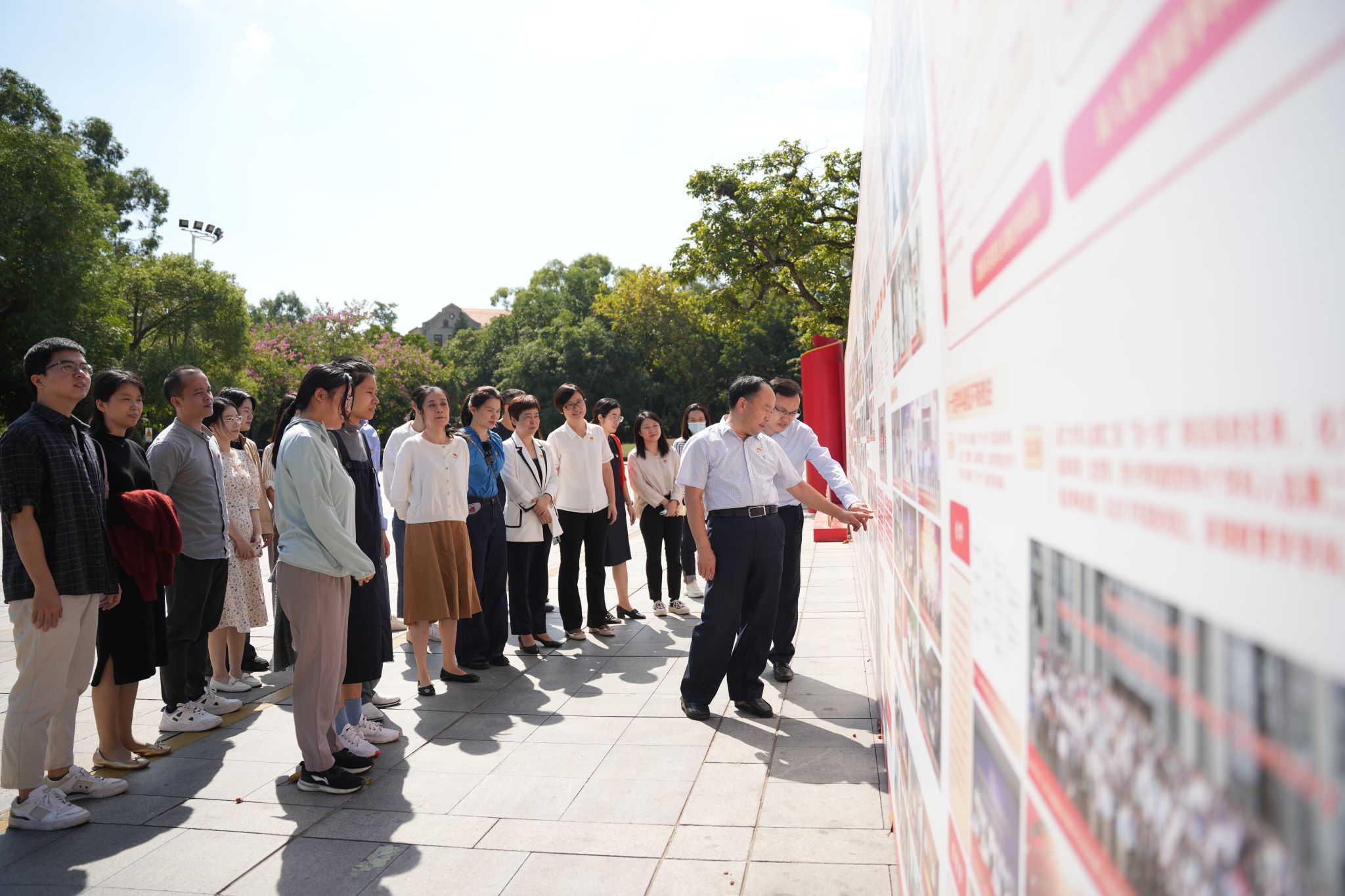支部成员首先来到科艺广场观看“向中国特色世界一流大学勇毅前行”主题成就展。本次主题成就展共分为十个板块,聚焦新时代厦大十年来的标志性成果、重大进展、重要工作。近400幅照片以画卷形式在大家面前徐徐铺开,支部成员们细细观看,深入了解图片背后厦大人锐意创新、逐梦追梦的十年故事。观展的同时,支部成员还结合策展时各自牵头负责的板块进行内容讲解和交流分享,进一步提升学习成效。大家纷纷表示,本次展览以图文结合的形式,记录了十年来厦门大学取得的非凡成就,展现了新时代厦大人“感恩、开放、创新、和谐”的文化品格,是学习了解学校发展变化的生动教材。