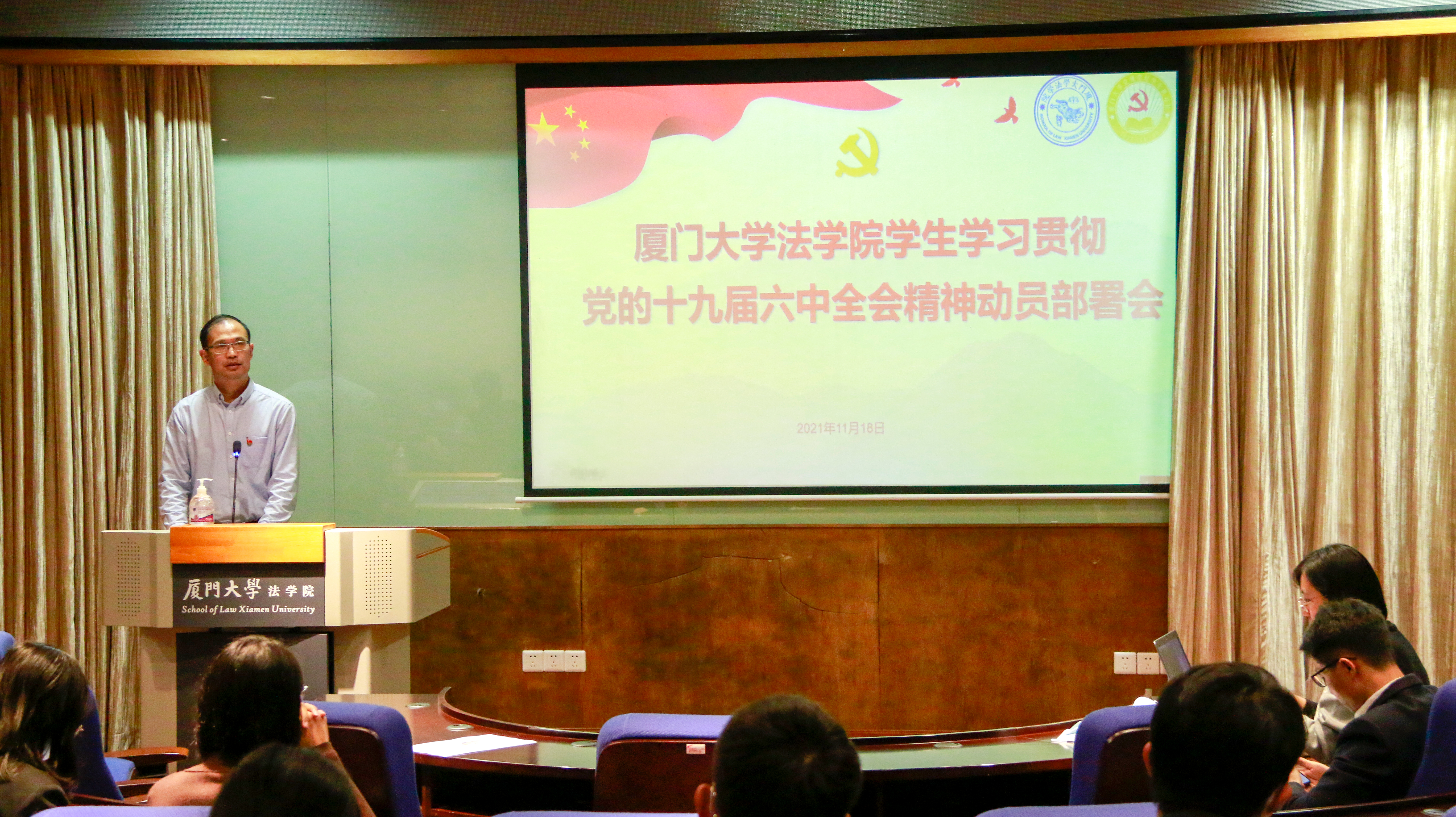 专题讲座后,法学院党委副书记郭锦星为法学院学生党员深入学习宣传贯彻党的十九届六中全会精神做出具体安排部署。他指出,深入学习宣传贯彻好党的十九届六中全会精神,是当前和今后一个时期的重大政治任务。全院上下要增强“四个意识”、坚定“四个自信”、做到“两个维护”,切实把思想和行动统一到全会精神上来,迅速掀起学习宣传贯彻的热潮。