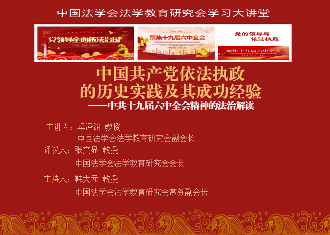 为深入学习贯彻党的十九届六中全会精神,11月18日晚,法学院组织学生党员在线学习“中国共产党依法执政的历史实践及其成功经验——中共十九届六中全会精神的法治解读”,该讲座由中国法学会法学教育研究会副会长卓泽渊教授主讲,由中国法学会党组成员、学术委员会主任、中国法学会法学教育研究会会长张文显担任评议人。